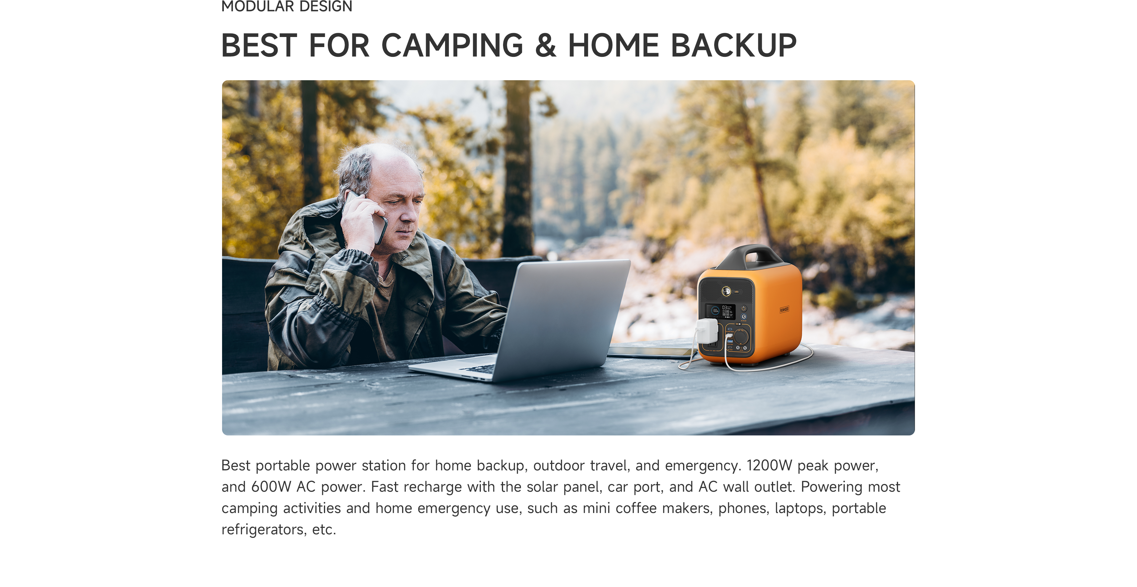 - Portable. Best for camping & home backup. 1296 Wh capacity, 1200W peak power, and 600W AC power. Fast recharge with the solar panel, car port, and AC wall outlet. Powering most camping activities and home emergency use, such as mini coffee makers, phones, laptops, portable refrigerators, etc.